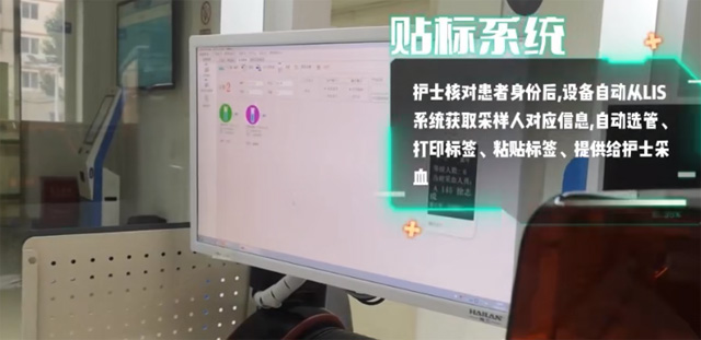 醫護人員核對患者的身份信息,設備自動獲取采樣人對應信息,自動選管,打印標簽、粘貼標簽,提供給醫護人員采血。選管、貼標、打條碼、出管,護士隻需要做消毒紮針工作就可以了。選擇對應顏色的采血管邊打印對應標簽,保留原有的刻度線進行貼標粘貼。自動複核提供給醫護人員使用。醫護人員取管確認信息後進行采血操作,將采完血的樣本放入傳輸係統裏麵。