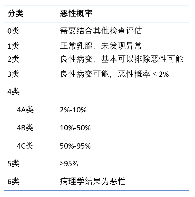 BI-RADS係統可分為0-6類。其中0類指醫生懷疑有惡性可能,但是沒有從超聲檢查中獲取充分的證據,需要結合其他檢查結果評估。其餘1-6類,類別越高,惡性概率越高。各類別惡性概率如下表所示。因此,如果看到自己的報告單上寫著“BI-RADS 1類”或“BI-RADS 2類”,可以稍稍放下心來,定期複查;如果報告單上寫著0類或3、4、5、6類,則需要及時前往醫院就診,請醫生給出專業意見。