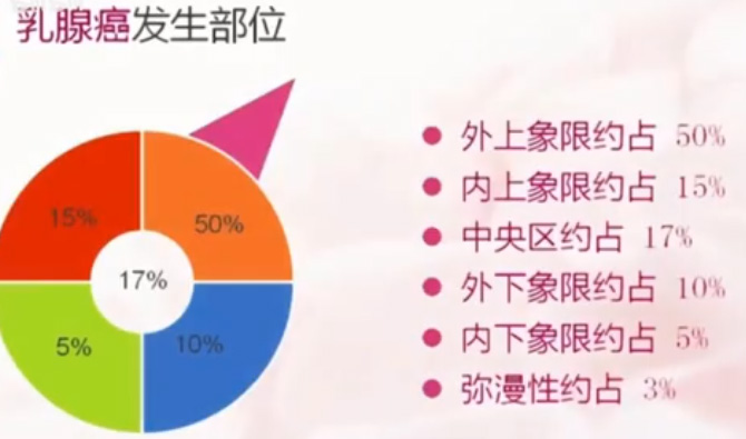 超聲影像最終的目的是要找出乳腺癌,做乳腺檢查的人絡繹不絕。那什麽是乳腺癌呢?它有什麽危害呢?乳腺癌是指發生於導管上皮,及末梢導管上皮的惡性腫瘤。乳腺癌的危害,一是致殘摧毀女性的自信。二是發病率及死亡率在所有惡性腫瘤中排名第一。對家庭的危害極大,婦女能頂半邊天,半邊天沒有了,這個家就相當於塌了一半。乳腺癌的常見發生部位,外上象限約占50%,內上象限約占15%,中央區約占17%,外下象限約占10%,內下象限約占5%,彌漫性約占3%。乳腺癌術後5年生存率一期:80-90%,二期:60-70%,三期:40%。因此 提高乳腺癌生存率和降低死亡率的關鍵在於早發現早診斷早治療。