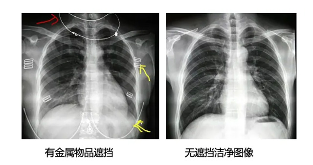 X光檢查是二維圖像檢查,組織機構密度大,內部細節顯示清晰。不過容易受服飾,首飾,厚的軟組織影響。所以檢查時候要把金屬去掉,厚的衣服脫掉,女性胸圍脫掉。