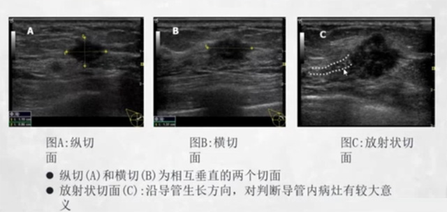 乳腺DR檢查乳腺的縱切和橫切為相互垂直的兩個切麵,放射狀切麵,也就是以乳頭為中心來進行一個掃查,為什麽要強調放射狀切麵呢?可以看到病灶是沿著導管方向的。沿導管生長方向,對判斷導管內病灶有較大的臨床意義。檢查留圖要有橫縱切麵,放射狀切麵。乳腺病灶的定位有兩種方法,一種是以乳頭為中心,經過乳頭水平線與垂直線,將乳房分為4個象限,外上下象限,內上下象限。另外一種是時鍾定位法,以乳頭為中心,采用12小時鍾點製,病變距乳頭的距離。