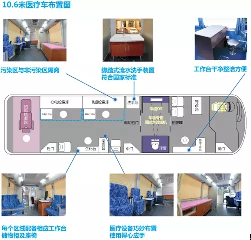 出口的醫療車配置相當的齊全,車長10.6米,總質量有14噸,國六排放標準,搭載柴油發動機,最高功率均為230kW。用於醫療診斷、健康體檢等。電子LED屏、車載廣播都有配備。電子化程度非常高。