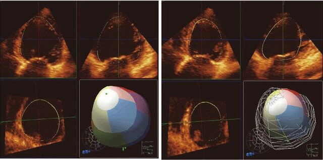 聲學定量(acoustic quantification, AQ)也稱心內膜自動邊緣檢測。通過計算機技術將未經濾波的超聲數據分為組織及血液成分,自動顯示血液/組織界麵。通過選定感興趣區,可實時計算麵積及變化率從而得出心髒泵血功能和心肌收縮指標。