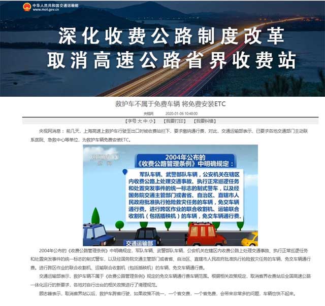 報道稱: 央視網消息 :前幾天,上海高速上救護車行駛至出口時被收費站攔下,要求繳納通行費,對此,交通運輸部表示,已要求各地交通部門主動聯係醫院、急救中心等單位,為救護車輛免費安裝ETC。 2004年公布的《收費公路管理條例》中明確規定,軍隊車輛、武警部隊車輛,公安機關在轄區內收費公路上處理交通事故、執行正常巡邏任務和處置突發事件的統一標誌的製式警車,以及經國務院交通主管部門或者省、自治區、直轄市人民政府批準執行搶險救災任務的車輛,免交車輛通行費。進行跨區作業的聯合收割機、運輸聯合收割機(包括插秧機)的車輛,免交車輛通行費。 交通運輸部表示,救護車輛不屬於《收費公路管理條例》規定的免交車輛通行費車輛範圍。根據相關政策規定,取消省界收費站後全國高速公路一體化運行的新要求,各地對自行出台的相關政策進行了清理規範。 顧誌峰表示,取消省界站以後,救護車跨省行駛,如果政策不統一,一個省交費,一個省免費,會帶來非常多的問題,車輛也快不起來。